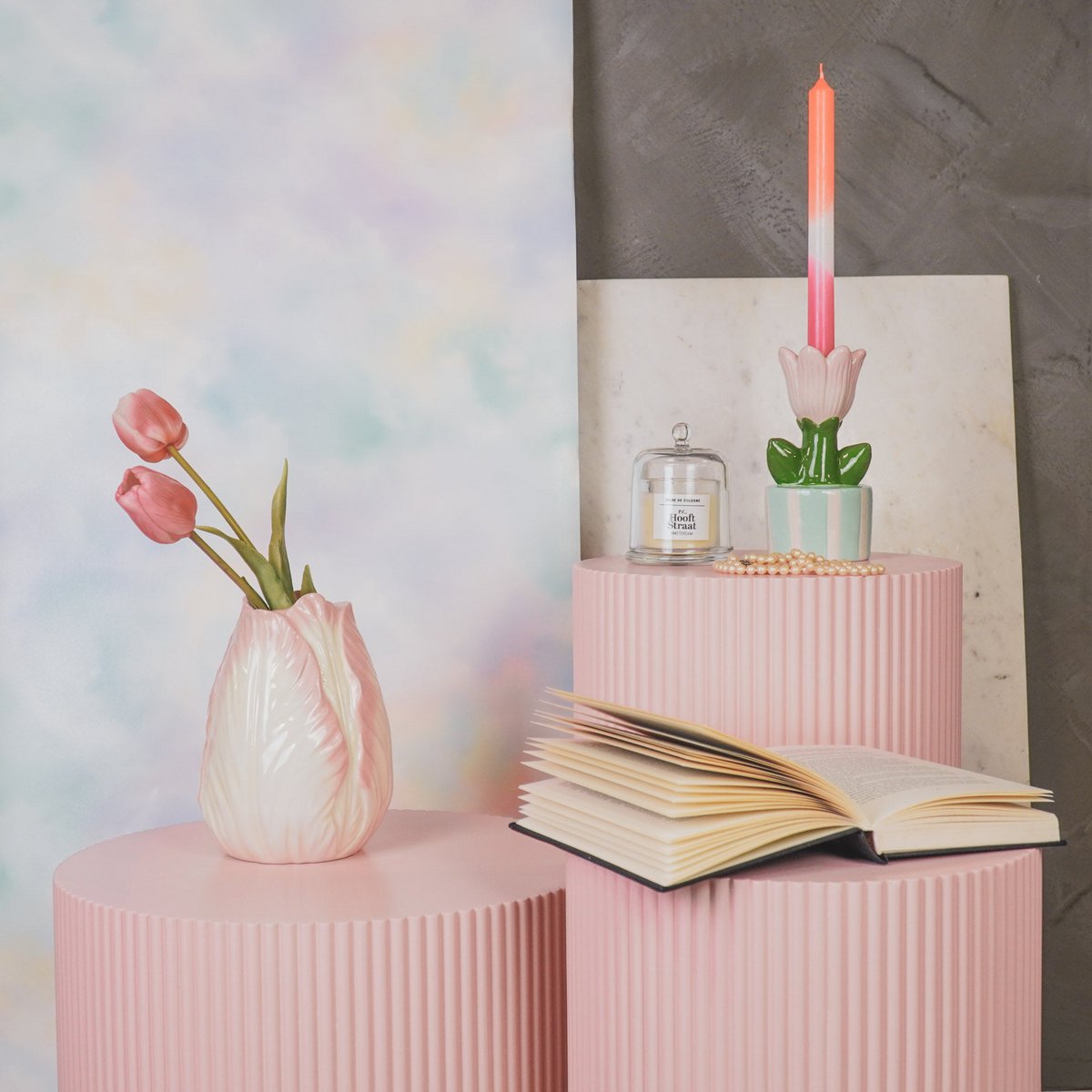 Tulpen van Amsterdam-tulpen zijn synoniem met Nederland, en met deze tulpenvaas heb je er een voor altijd in je huis. De vaas heeft de vorm van een tulphoofd en heeft een elegante, sprookjesachtige kwaliteit. Belangrijkste kenmerken: Gemaakt van: StonewaredImensions: 14x14x19cm Styling Tip: wat kan nog meer passend zijn in deze prachtige pastelkleurige tulpenvaas dan tulpen zelf?