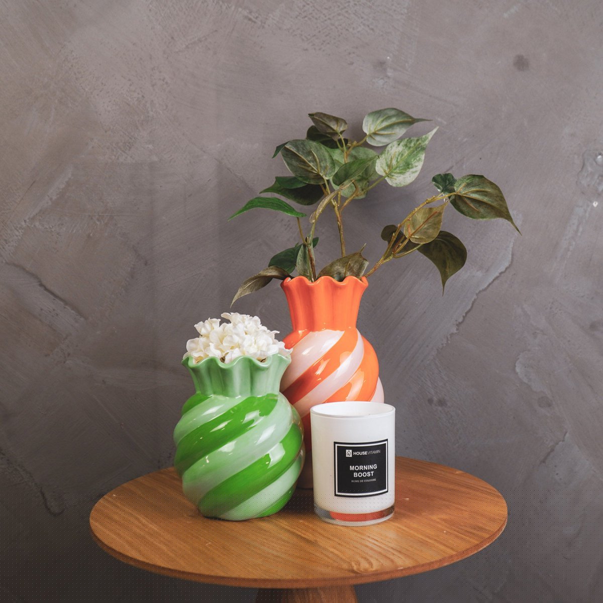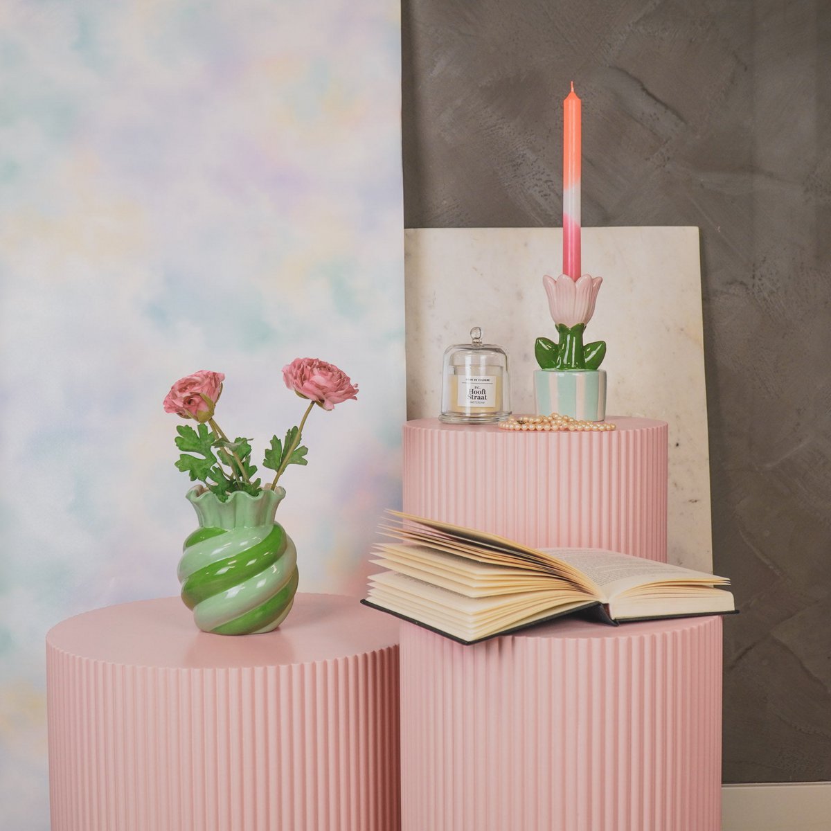 Vaas! Je kunt nooit genoeg vazen hebben. Dit is echt een snoepachtige vaas in vrolijke kleuren. Deze wervelkant met munt en groene strepen fleuren onmiddellijk een kamer op, en dat zal je gelukkig maken. Belangrijkste kenmerken: Gemaakt van: StonewaredImensions: 13x13x15.5cm Styling Tip: Wat je er ook in stopt, deze vrolijke gestreepte vaas zal schijnen, ongeacht wat!